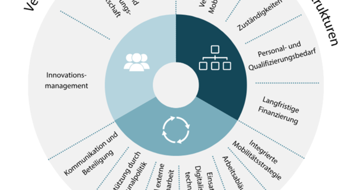 Eine gesunde Verwaltungsstruktur zeichnet sich durch klare Zuständigkeiten, qualifiziertes Personal und eine gesicherte, langfristige Finanzierung aus. Die Mobilitätsplanung sollte dabei innerhalb der Kommune als gemeinsame, bereichsübergreifende Aufgabe verstanden werden. Effiziente Verwaltungsprozesse zeichnen sich durch integrierte Strategien, schlanke möglichst digitale und agile Arbeitsabläufe aus. Eine integrierte Mobilitätsstrategie mit Vision, konkreten Zielen, passenden Maßnahmen und stetiger Erfolgskontrolle bildet die Basis für die Mobilitätsplanung. Ebenso wichtig ist eine Verwaltungskultur, die von Offenheit, Innovationsgeist und Zusammenarbeit über Ressortgrenzen hinweg geprägt ist. Führungskräfte, die den kulturellen Wandel aktiv vorleben, spielen eine zentrale Rolle.